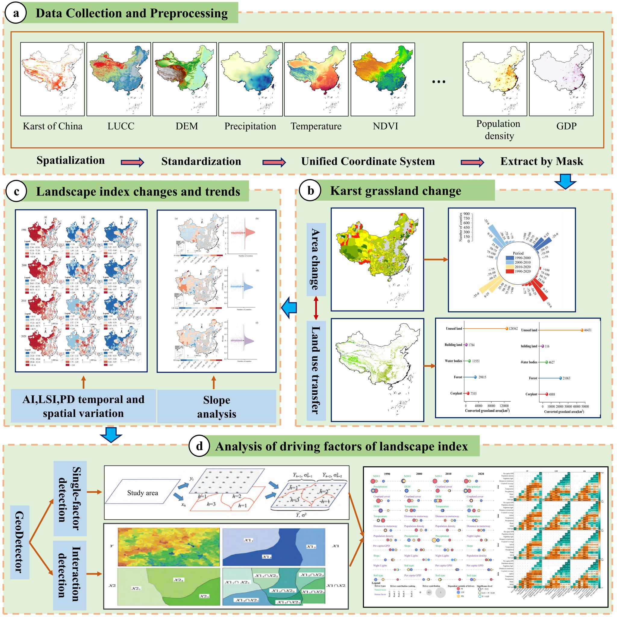 近日,我校喀斯特研究院熊康宁团队在环境生态领域TOP期刊《Ecological Indicators》(中科院SCI一区)在线发表题为“Spatiotemporal dynamics and driving mechanisms of grassland landscape fragmentation in China’s karst regions”的研究论文。该论文根据喀斯特草地景观破碎化导致生态系统退化的实际问题,针对景观格局时空演变与驱动机制的科学问题,结合科学推进石漠化综合治理的国家战略和地方需求,在代表地貌多样、生态脆弱性显著的中国喀斯特地区,综合运用GIS空间分析、Fragstats景观格局指数、土地利用转移矩阵和地理探测器模型,对1990-2020年中国喀斯特草地景观破碎化的时空演变格局进行了多尺度量化,系统分析了不同草地破碎化的空间分异特征,提出了差异化、协调化的喀斯特草地生态系统保护与恢复策略建议。