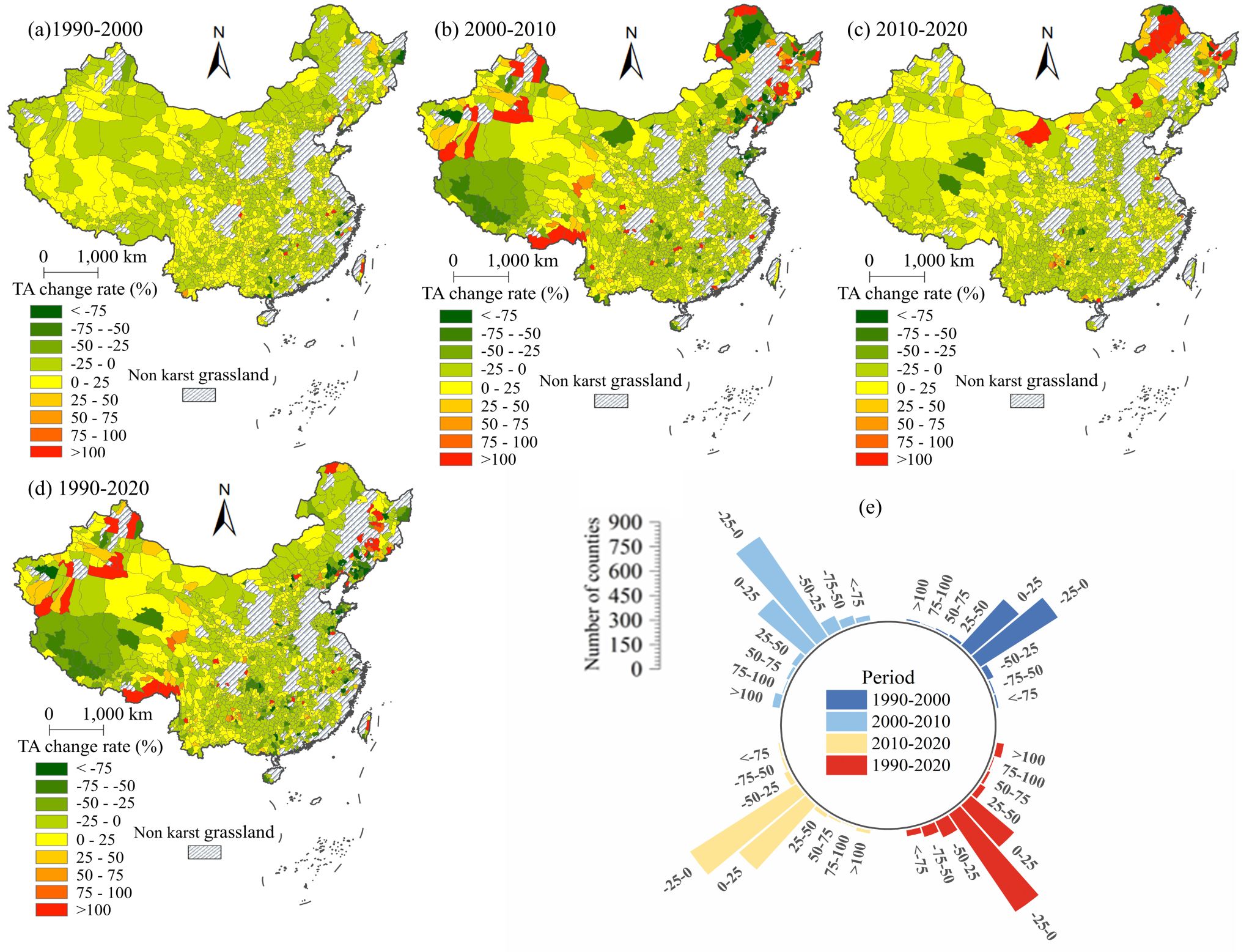 中国县域喀斯特草地面积变化率
