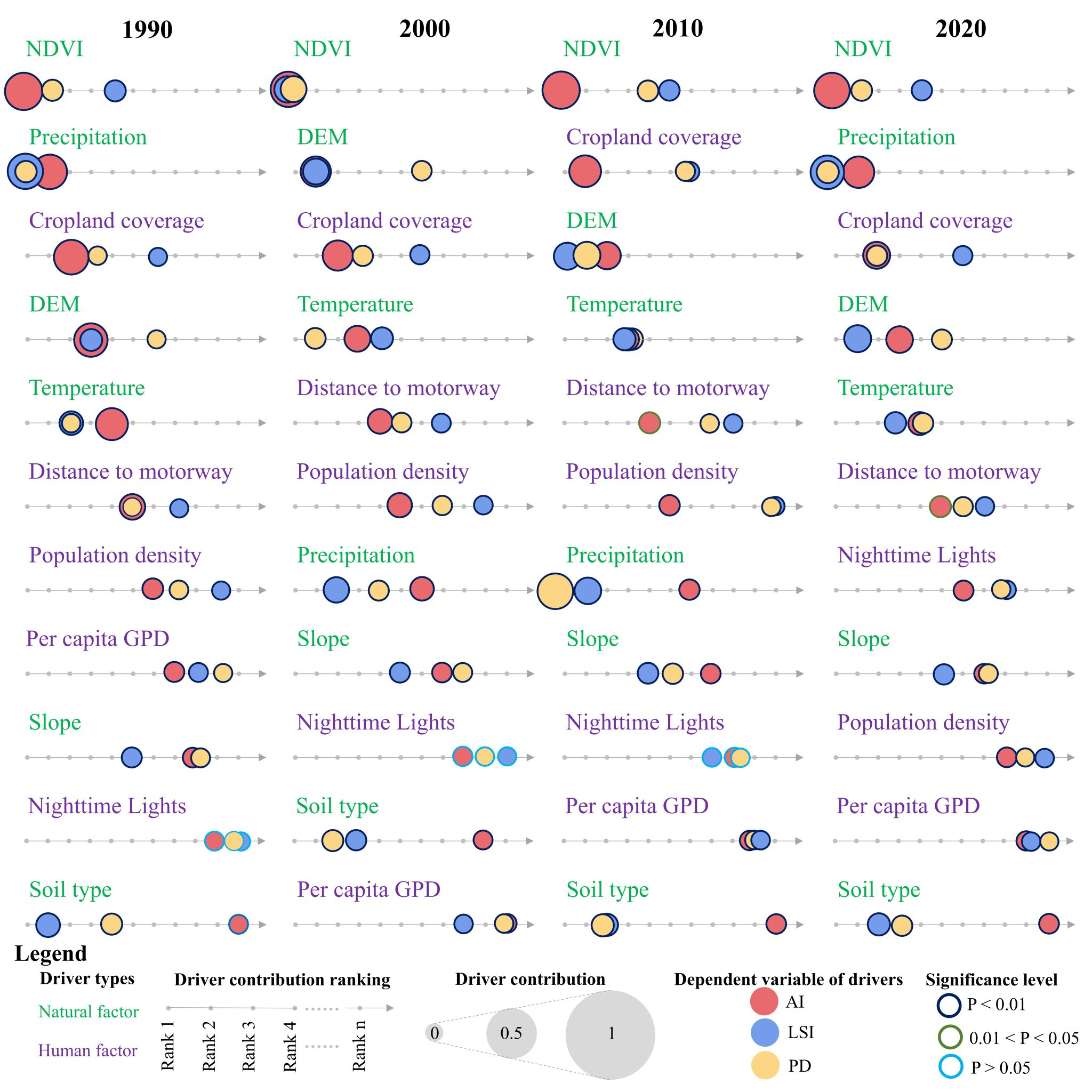 该研究揭示了喀斯特草地景观破碎化的驱动机制自然与人为因素交互作用的复杂动态性。地理探测器模型的分析结果显示,从单个因子来看,自然因素是解释草地景观格局空间分异的主要驱动力。然而,人类活动因子的影响力正持续增强,并且其与其他因子的交互作用显著。表明整个驱动机制正在经历从“自然主导”向“自然-人为共同主导”的转变。