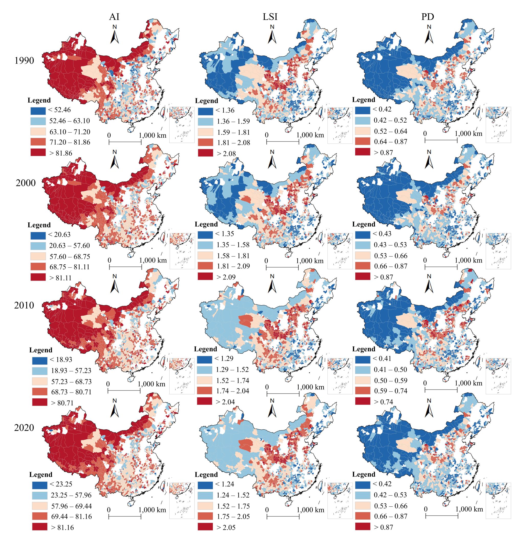 该研究发现了喀斯特草地的景观破碎化表现出显著的空间异质性。在地形过渡带,如云贵高原和黄土高原过渡区,AI值下降与PD、LSI值升高表明人类活动干扰加剧了喀斯特草地斑块形状的复杂化并降低其连通性。而在青藏高原等自然地理屏障明显的区域,草地破碎化程度相对较低,但其LSI值的局部升高可能反映了边缘开发压力。