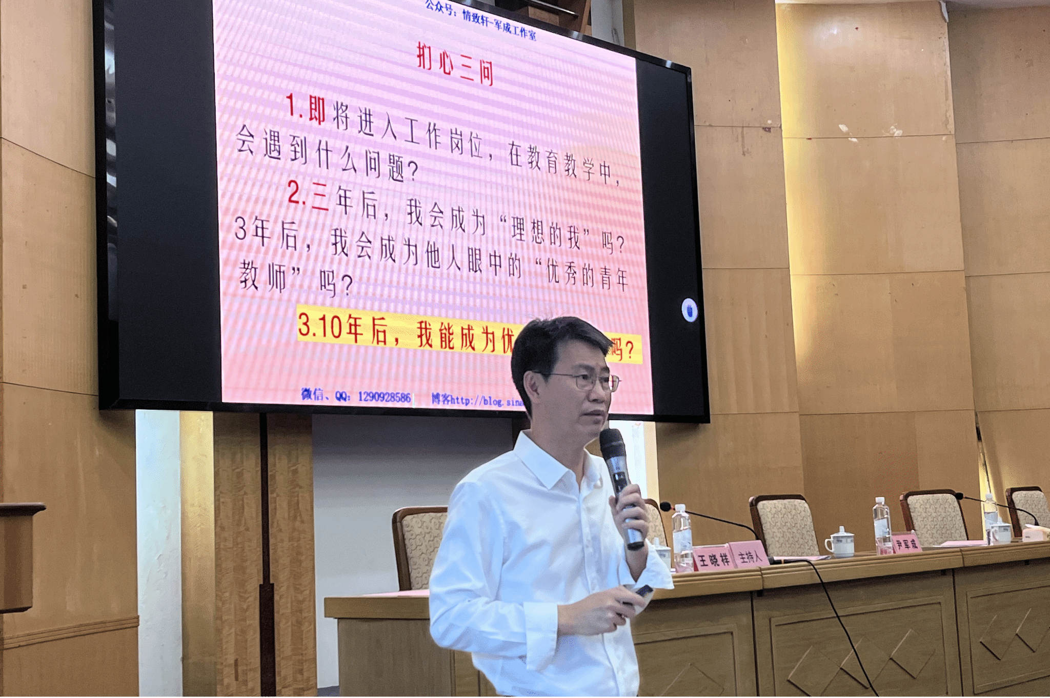 尹军成以《师德培育与专业发展:基于“术道融合”的教育思考》为题开讲,以“扪心三问”切入,通过剖析课堂教学、师生交流、日常管理等具体教育之“术”,层层递进揭示背后“仁爱之心、立德树人、终身学习”的教育之“道”,为教师专业成长指明核心方向。
