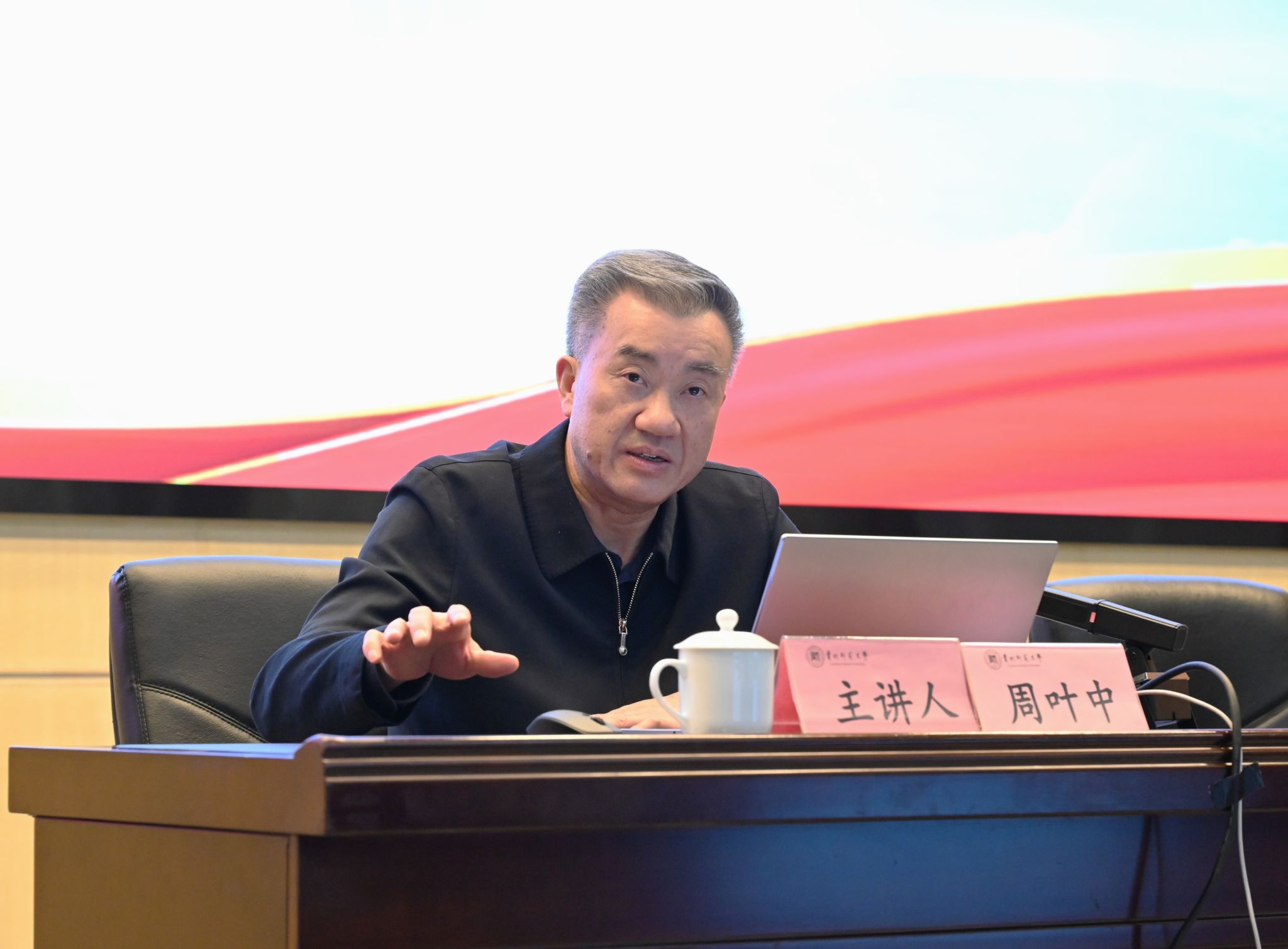 为深入学习贯彻习近平新时代中国特色社会主义思想,全面贯彻落实习近平法治思想的核心要义与实践要求,不断提升干部职工的法治素养与依法治校能力,10月24日下午,学校在东区会议中心一楼学术报告厅举办“干部能力素质提升工程”专题讲座。武汉大学人文社会科学教授、博士生导师,武汉大学党内法规研究中心主任周叶中应邀作题为《以习近平法治思想为指导 在法治轨道上深化改革 推进中国式现代化》的专题辅导报告。校党委书记黄其松主持,校领导张绍东、陈应勇、路言莉、骆最勇、刘瑾、管新福、冯海涛、伍权、张道伟,校党委常委何小明、丁龙出席。