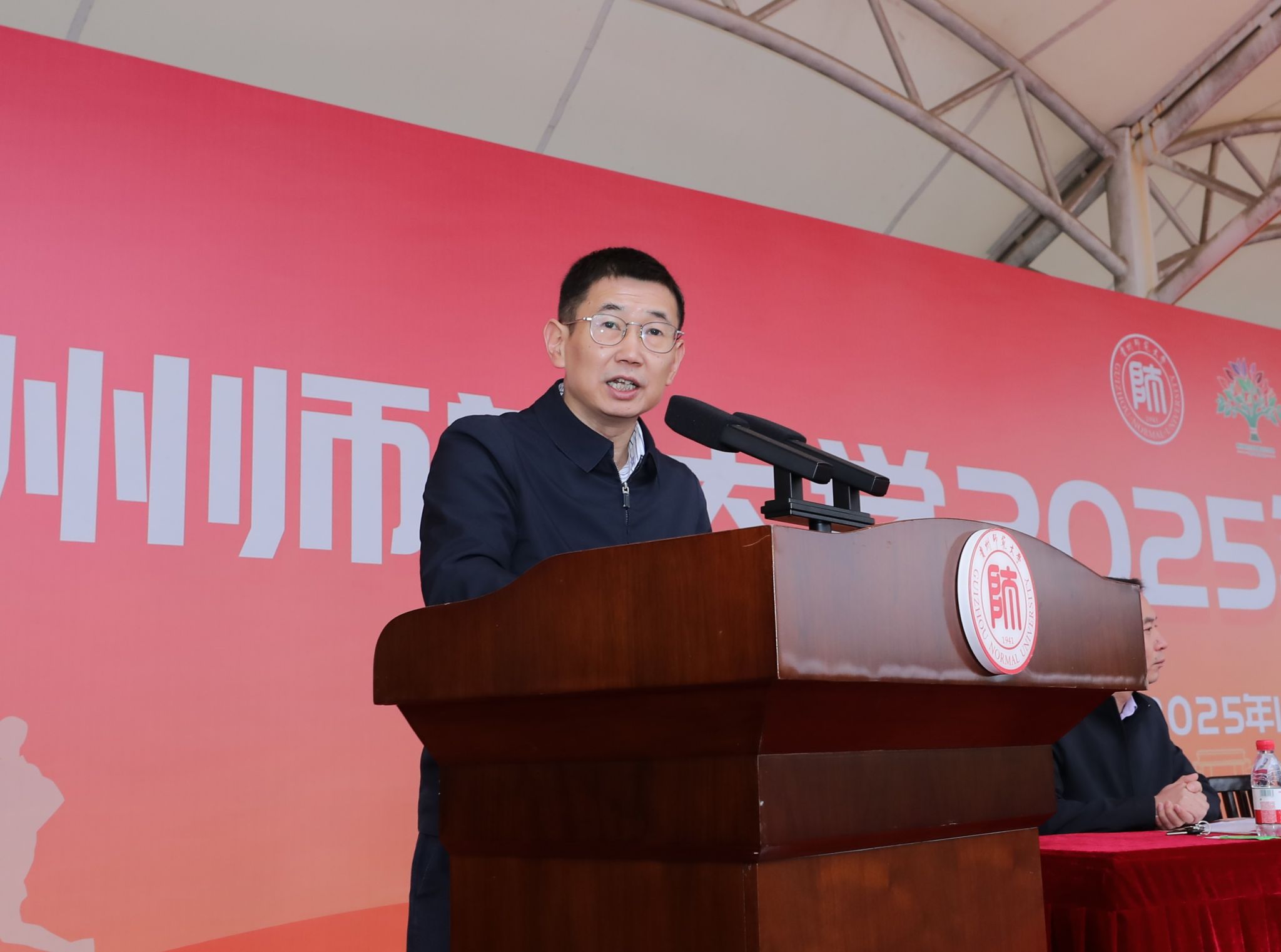 张绍东在致辞中向筹办师生致谢,向全体参与者致以问候。他指出,2025年作为体育强国建设关键之年,本次艺术节是学校践行“五育并举”教育方针的重要实践,更是师生彰显活力、锤炼素养的广阔舞台。此前,我校代表团在贵州省第六届学生运动会中斩获54金40银18铜,打破10项赛会纪录,勇夺5个团体总分冠军,尽显强劲竞技实力与拼搏精神。他强调,学校始终深耕校园文体建设,通过篮球赛、健身跑等多元活动厚植文体氛围,他期望全体师生以此次艺术节为契机,在运动中强健体魄,在协作中凝聚合力,为学校建设区域高水平大学注入澎湃动能。