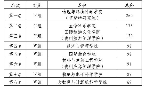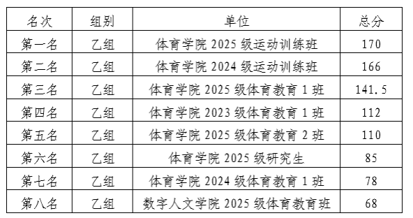 10月31日,2025年贵州师范大学体育文化艺术节田径运动会落下帷幕,在三天的比赛过程中,全体运动员用饱满的热情、昂扬的斗志,为各自学院和班级奋勇拼搏、夺取荣誉,充分展现了我校学子健康向上、朝气蓬勃的精神面貌。现将甲、乙组团体前八名成绩公告如下: