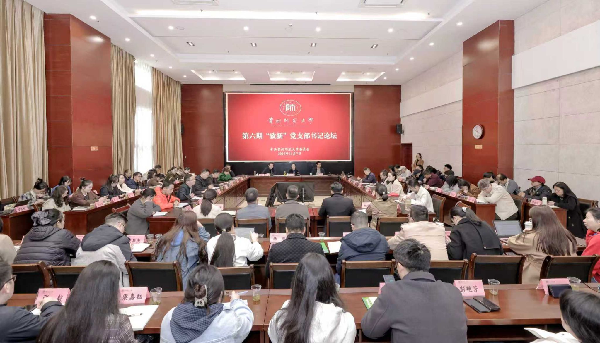 11月7日,由校党委组织部主办、马克思主义学院党委承办的第六期“致新”党支部书记论坛在东校区行政主楼六楼多功能厅举办,主题为“党建与业务深度融合的路径与保障探析”。校党委副书记路言莉出席并讲话。学校及贵阳人文科技学院有关基层党务工作人员、师生党支部书记代表共100余人参加了论坛。论坛由校党委常委、统战部部长,马克思主义学院党委书记路世传主持。