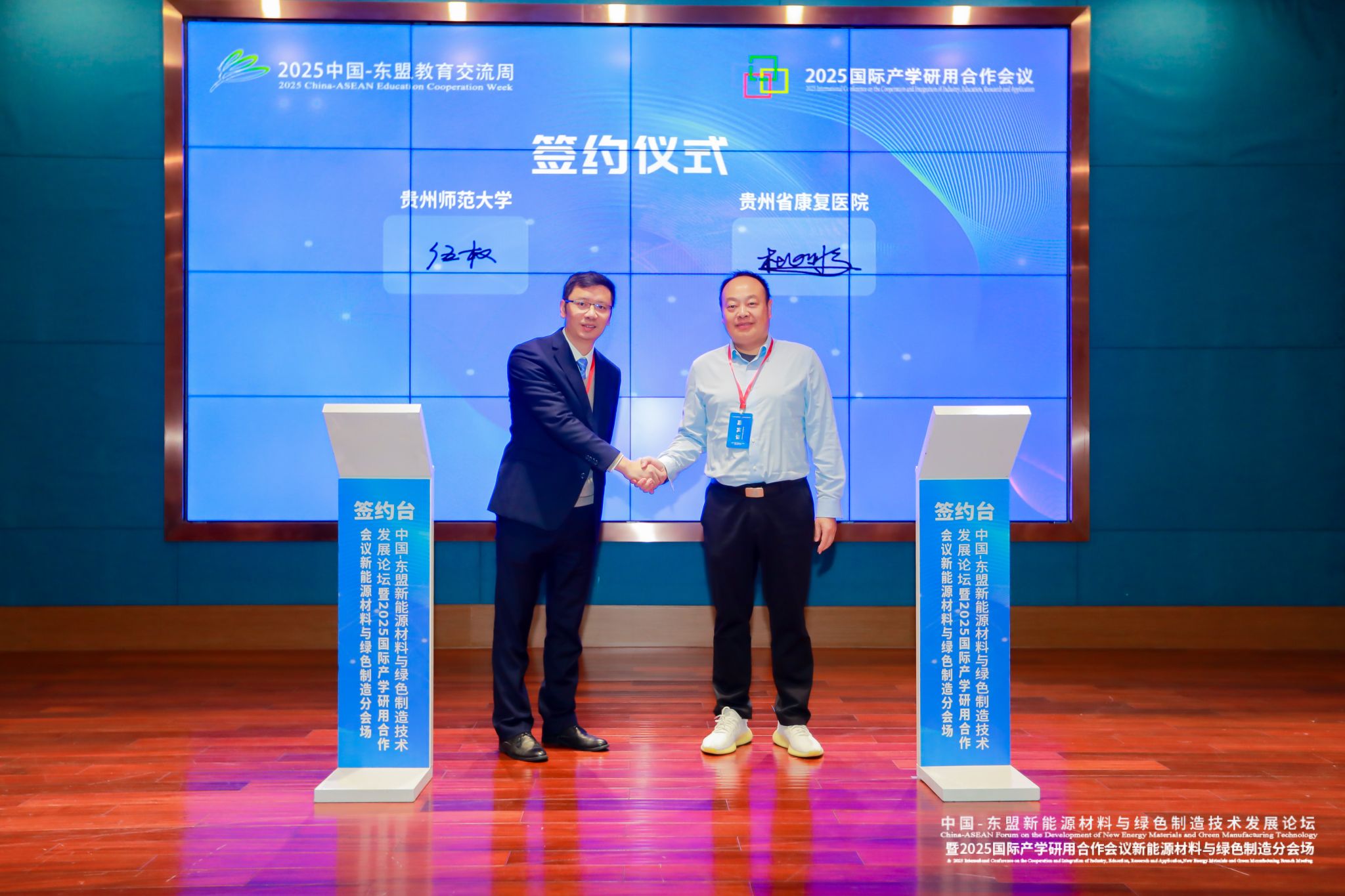 11月29日,中国-东盟新能源材料与绿色制造技术发展论坛暨2025国际产学研用合作会议新能源材料与绿色制造分会场会议在中国—东盟教育交流周永久会址举行。本次会议由贵州省教育厅主办,贵州师范大学承办,贵州省康复医院、上海鲸鱼机器人科技有限公司、贵州省机械工程学会数字仿真专业委员会协办。我校副校长伍权、贵州省教育厅国际合作与交流处处长叶森出席开幕式。