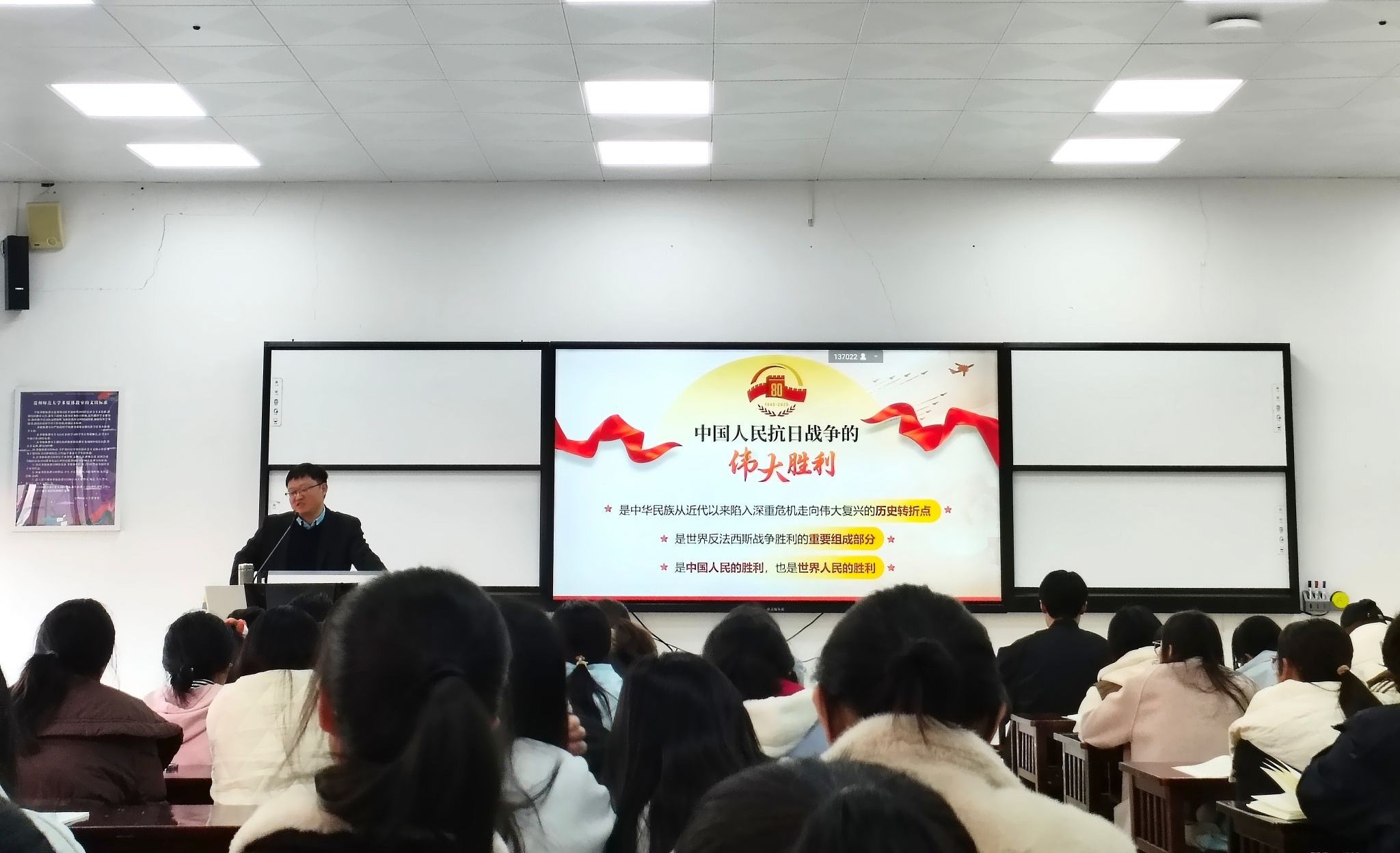 管新福系统梳理了从局部抗战到全面抗战的历史进程,深入解读了“天下兴亡、匹夫有责”的爱国情怀、“视死如归、宁死不屈”的民族气节等伟大抗战精神的核心内涵。针对新时代弘扬抗战精神的现实意义,他特别指出,今年我国隆重举行纪念大会、阅兵仪式等系列活动,正是要以史为鉴、以史增信,让伟大抗战精神成为凝聚民族力量的精神纽带。他勉励文学院学子要发挥专业优势,从《松花江上》《黄河大合唱》等抗战文艺经典中挖掘精神密码;在抗战史料整理、红色故事传播中传承红色血脉;在方言叙事、文学创作中讲好新时代抗战精神传承故事,让跨越时空的精神火炬代代相传。