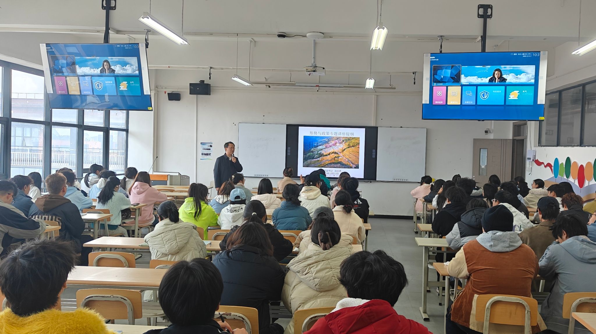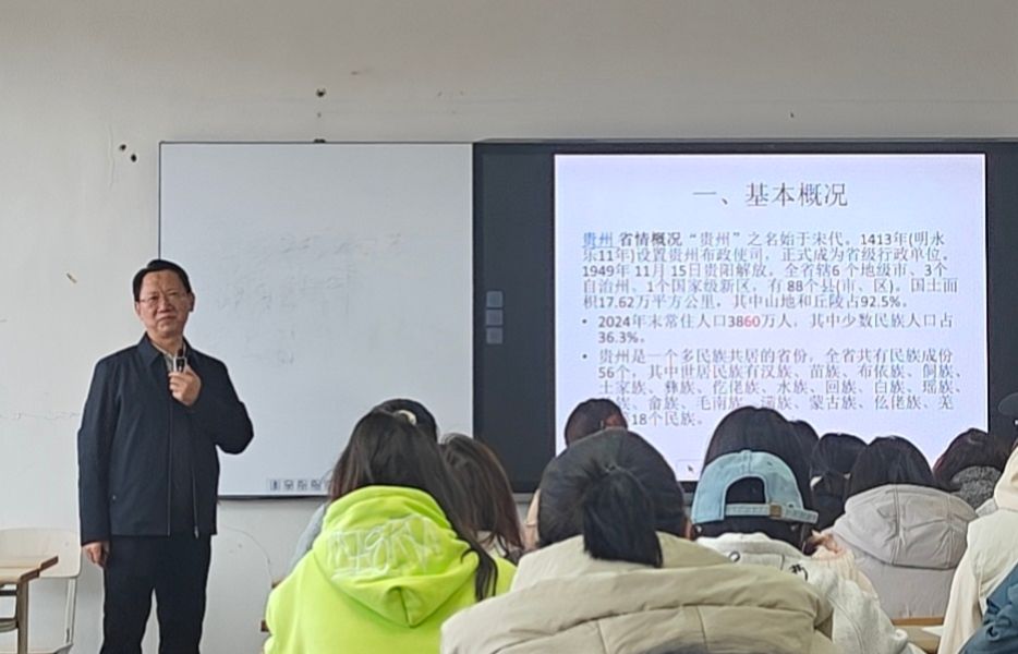 12月12日上午,校党委副书记陈应勇在西区2610教室为数字与人文学院2025级本科生讲授《形势与政策》课,课程围绕“贵州‘千年之变’——新贵州”主题,凭借生动翔实的案例,从“贵州省情概况”“如何看待贵州经济社会发展”到“怎样推动贵州经济社会发展”“青年学生怎么干”等四个维度,剖析了贵州省近年来经济增长的亮眼成果。
