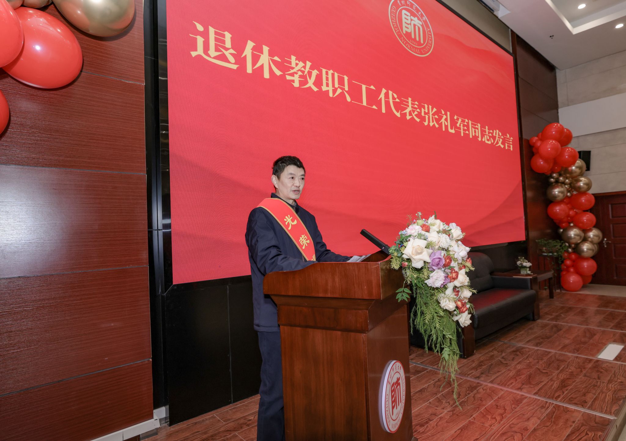 张礼军同志代表荣休教职工发言,他深情回顾了在校工作的难忘岁月,表达了对教育事业与学校的深厚情感,并祝福在职教师接续奋斗,共同书写学校发展新篇章。