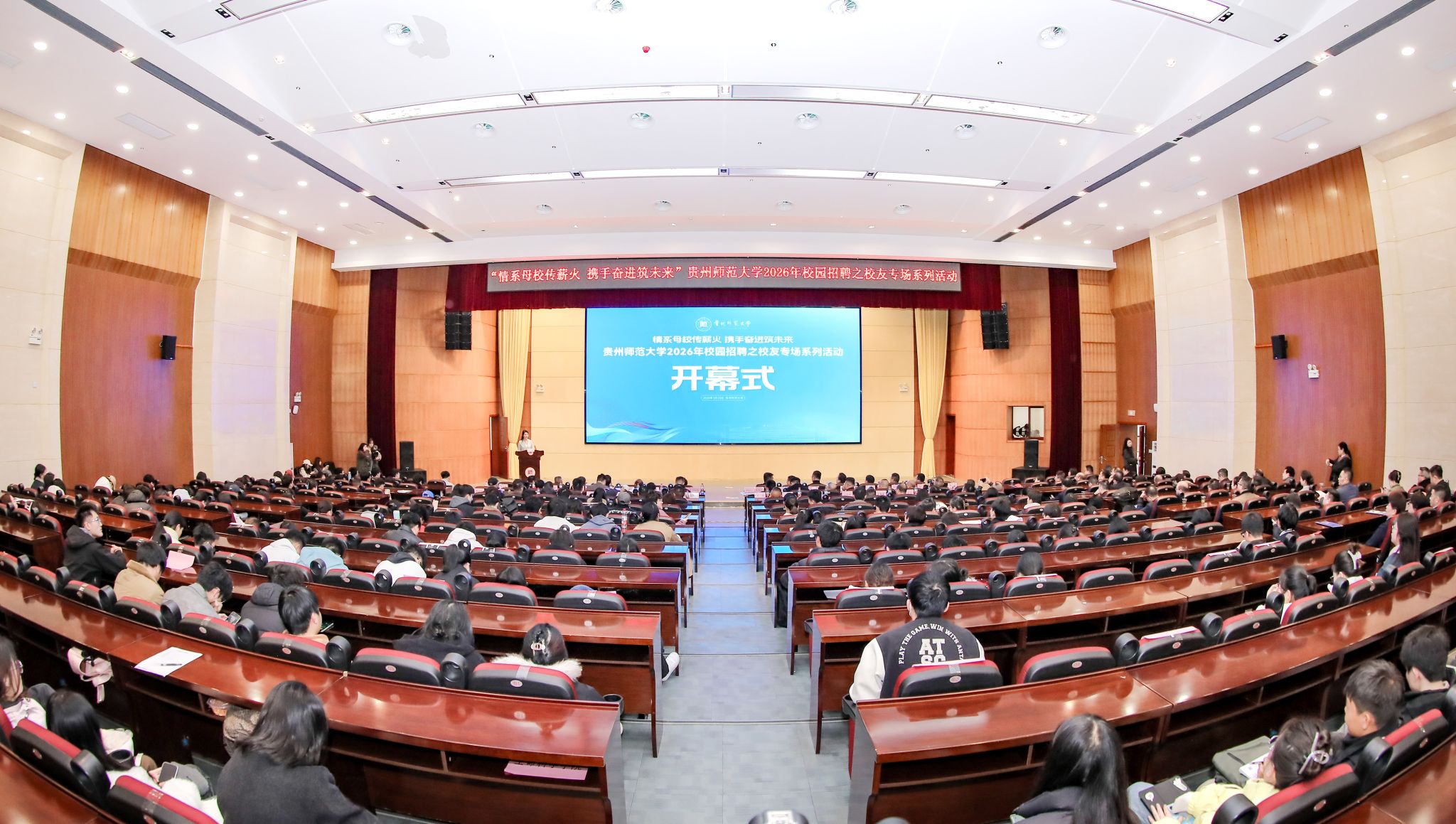 开幕式在东区会议中心一楼学术报告厅举行。省人力资源和社会保障厅党组成员、副厅长肖震,省委教育工委委员、省教育工会主席江山,贵州师范大学校友企业家协会会长陶晓旭、校友会海南分会会长李小刚、校友会冶金分会会长张皓、校友会粤港澳大湾区分会会长黎永梅,校领导张绍东、陈应勇、骆最勇、冯海涛、张道伟、吴复忠出席。省教育厅、省人力资源和社会保障厅相关处室负责人,校友企业家代表,学校相关职能部门、各学院负责人及2026届毕业生代表参加。