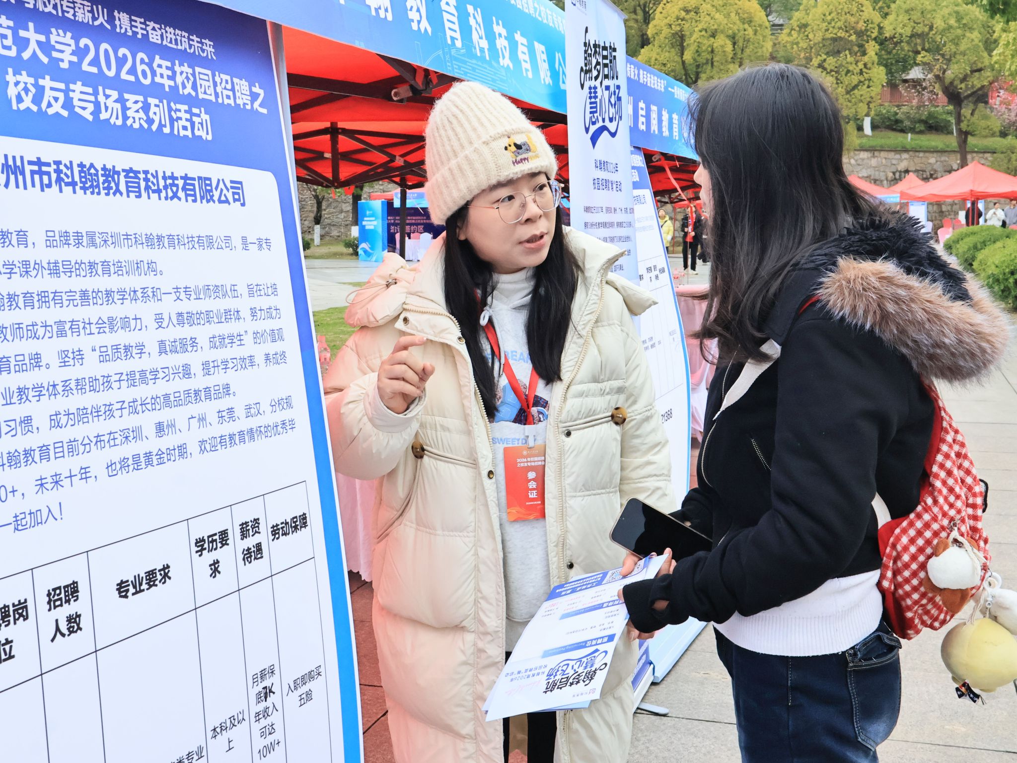 校友专场招聘会在东区香樟广场举行。现场人头攒动,气氛热烈。张绍东亲临招聘会现场,驻足多个校友企业展位,询问了解岗位需求,并与毕业生亲切交谈,询问求职意向。