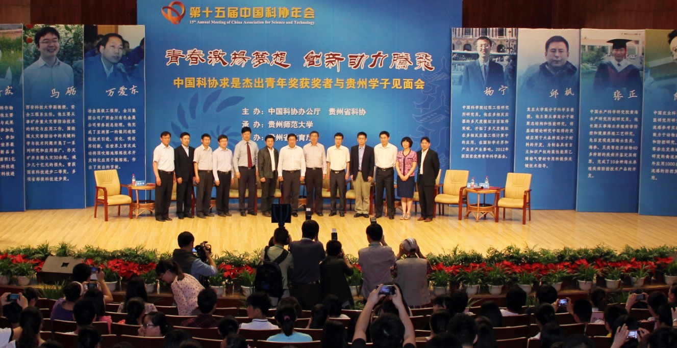 5月24日,根据第十五届中国科协年会的安排,第十六届中国科协求是杰出青年成果转化奖获奖者与贵州大学生见面会在我校音乐厅举行。中国科协书记处书记徐延豪,贵州省政协副主席、贵州师范大学副校长谢晓尧,中国科学院院士、中国科协求是奖评委张泽,贵州省教育厅副厅长级督学潘建春,贵州省科协正厅级干部杨献忠,贵州师范大学党委副书记褚光荣以及9位求是杰出青年成果转化奖获奖者出席。褚光荣主持见面会,谢晓尧致欢迎词。本次见面会的主题为“青春激扬梦想 创新助力腾飞”,来自包括我校在内的贵州高校的700余名大学生参加了见面会。