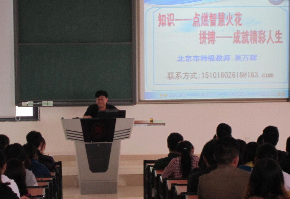 吴老师围绕“规划——找准人生目标”、“学习——为生命加温”、“写作——让思想走的更远”、“机遇——留给有准备的人”四个章节对自己的成长经历、学习生涯、工作轨迹向同学们分析了作为在校大学生应该有的人生目标及自己的规划,采用幽默风趣的数学语言引领同学们思考自己的人生坐标。