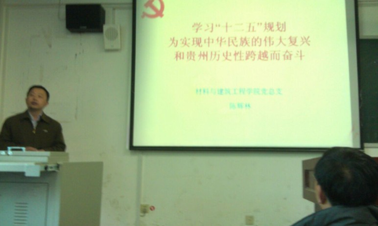 材料与建筑工程学院高度重视贵州师范大学“精品党课”征集评选工作,10月25日,材料与建筑工程学院党总支书记陈辉林给来自学院各年级、各专业的党员、入党积极分子共计80余人主讲题为《学习“十二五”规划,为实现中华民族的伟大复兴和贵州历史性跨越而奋斗》的专题党课,参加全校“十佳党课”的评选。校党委组织部罗税书记、杨淑珍老师、校友会副秘书长刘明华、统战部部长全学军担任评委,材建院党总支副书记郑环旁听了党课。