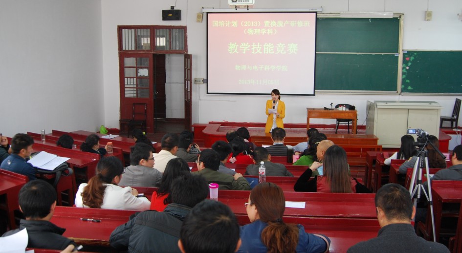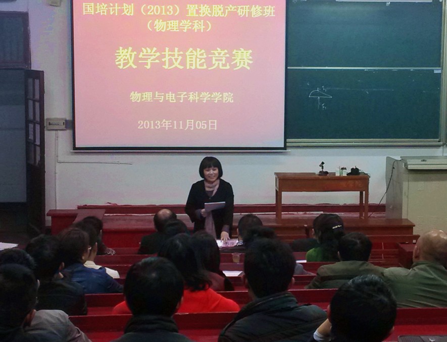 11月5日,物理与电子科学学院在733教室举行了“国培计划”(2013)置换脱产研修班(物理学科)学员教学技能竞赛。贵州师范大学教务处副处长周勋、院党委书记宇燕、院长陈世国、党委副书记李应发、副院长宋晓书、支启军、贵州省教学名师石红、学科主任沈光先、刘万松、李琼敏、杨向东及徐梅、庞礼军、孙卫真等老师出席并担任本次竞赛评委。大赛还特别邀请了西南地区国培专家库专家、贵阳市教科所副所长赵兵老师和贵州省骨干教师、贵阳市云岩区教育名师邹雪青老师出席并担任评委。