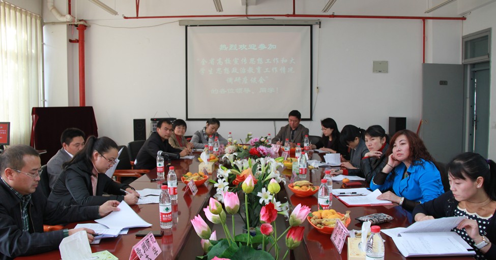 为进一步增强高校宣传思想工作和大学生思想政治教育工作的针对性、实效性,按照中央领导同志和教育部的有关要求,贵州省教育厅于2013年11月12日在我校马克思主义学院会议室召开了“高校宣传思想工作和大学生思想政治教育工作情况调研会”,调研会由贵州省教育厅社政处副处长赵祥主持,省教育厅社政处秘书王晓红,贵州大学、贵州师范大学、贵阳医学院、贵阳中医学院、贵州民族大学、贵州财经大学、贵州师范学院、贵州广播电视大学、贵州理工学院等高校的宣传部部长、学生处处长、马克思主义学院院长及各高校师生代表20余人参会。