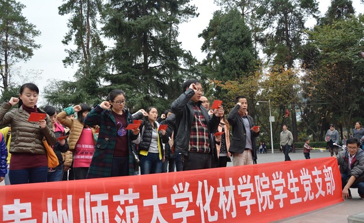 11月16日,化学与材料科学学院2011级学生党支部全体成员和2012、2013级学生联合党支部全体党员及入党积极分子发展对象共近40人在学院党委组织员孟忠常、学生党支部书记和辅导员周能、王亚丽、辅导员熊树林、罗熙兰等老师的带领下参观了遵义会议会址和红军山,开展了“重踏红色征程、重瞻红色圣地、重访红色遗迹、重拾红色记忆、重温入党誓词”等主题教育活动,用党的优良传统和作风教育广大党员坚定理想信念,坚守共产党人精神追求。