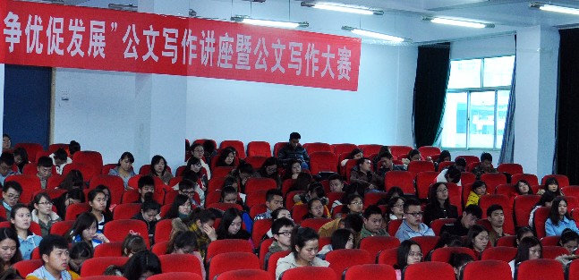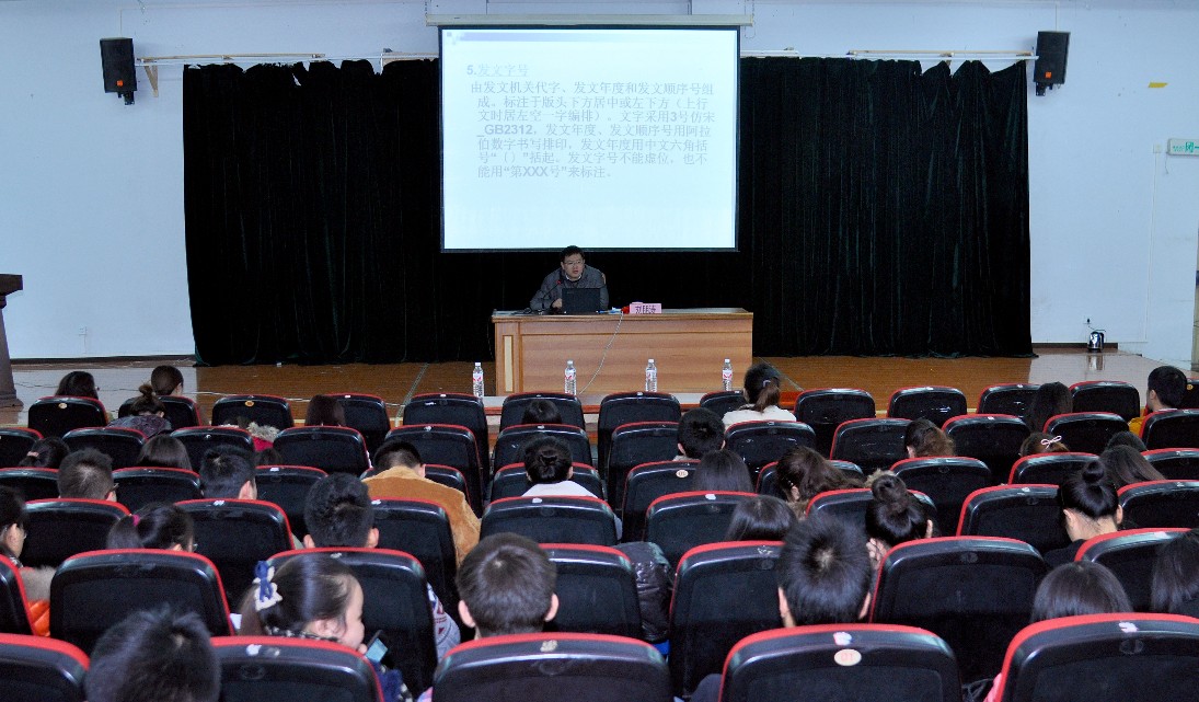 11月22日,由校办公室刘朋涛主讲的题为“党政机关公文格式简介”的公文写作讲座在宝山校区田家炳教育书院五楼多功能厅开讲,系“转变作风提效能,创先争优促发展”活动之一。学校办公室副主任路世传、文学院组织员苗庆等出席。该讲座由文学院党委主办,学校办公室第一党支部及文学院11级-12级学生联合党支部承办。文学院预备党员、入党积极分子等100余人到场聆听。
