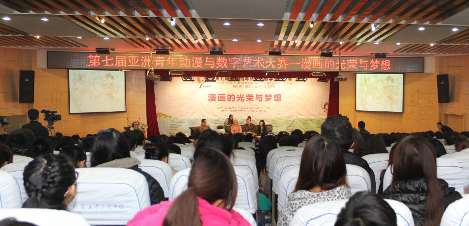 11月23日上午,第七届亚洲青年动漫与数字艺术大赛论坛在白云校区求是讲堂举行。世界漫画组织常任副主席马琳娜、美国政治漫画家塔格尔、中国“十大新锐女漫画家”之一的阿梗亲临论坛现场与同学们进行交流,师生代表近500余人参加了本次论坛。