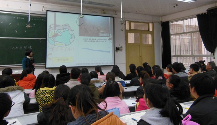 为了提高教师教学技能,切实提升教师业务水平。生命科学学院于2013年11月22日下午2:30在九教202教室举行了《人口与环境》的校级公开课。院党委书记王亚筑、副书记李建、校教务处督导组老师及生科院全体教师参加听课与评课。公开课主讲彭惠蓉老师取材新颖、贴近生活,深入浅出,课堂气氛活跃,师生互动良好。
