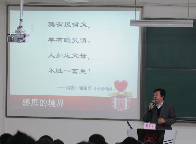 11月23日—24日,著名演讲家、演讲教育家、中国演讲协会副会长、中国金口才教育中心演讲教授、春晖行动发展基金会副理事长蔡顺华老师先后在我校三校区作题为“寸草报春晖·共圆中国梦”的道德讲堂专题讲座,全校1000余名团员青年聆听了讲座。