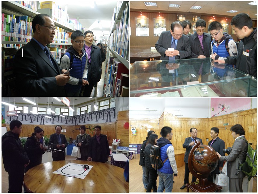 11月27日下午,韩国国立大邱教育大学校长一行3人在图书馆副馆长陈俊、外事处老师刘泽村等陪同下参观了学校图书馆,了解图书馆馆藏、服务情况,并与在图书馆自修的学生友好交谈。参观过程中,南承仁校长对图书馆收藏的贵州地方文献、提供给学前教育专业学生学习实践的“学前教育专题资料室”尤为关注,与图书馆工作人员就古籍保存、丝绸之路与中韩文化等问题进行了交流。