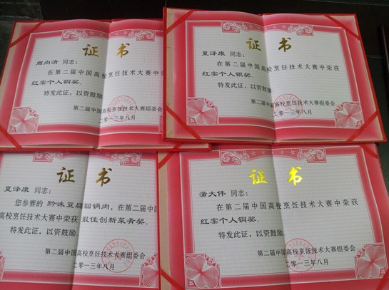 本次大赛共有全国四百余所高校参赛,经过三天紧张角逐,我校代表队获红案团体三等奖、红案个人银奖1枚,个人铜奖2枚,创新奖1枚。