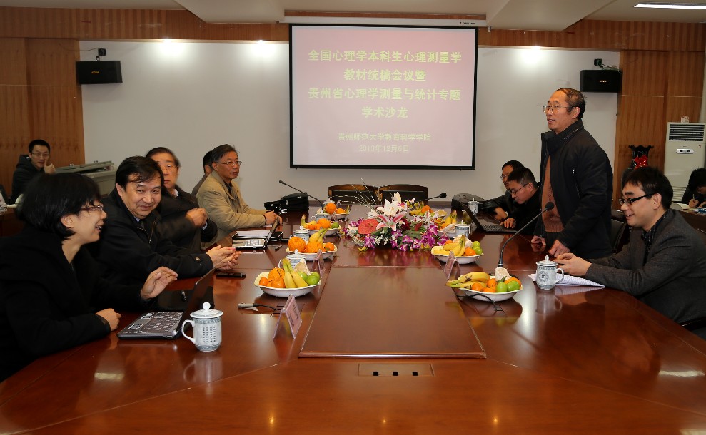 12月6日,全国心理学本科生《心理学测量学》教材统稿会议暨贵州省心理学测量与统计考题学术沙龙在我校田家炳教育书院七楼会议室举行。西南大学、华东师范大学等十二所全国重点师范院校心理测量学的专家、学者参加。会议由我校副校长赵守盈主持。