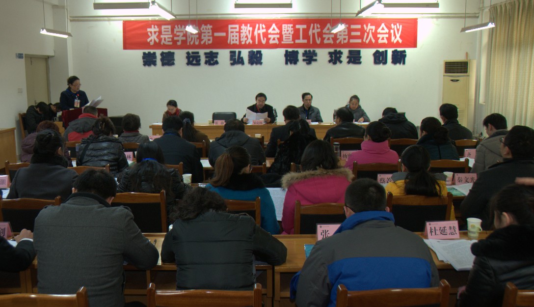 校党委副书记、纪委书记邹克扬在讲话中对求是学院十二年来的发展成绩给予了充分肯定。邹克扬指出,求是学院连续五年被评为“全国百强独立学院”,这是全院教职工团结进取、拼搏奋进的结果,充分显现了求是学院的实力和魅力;学院荣获第二届全国民办高校党的建设和思想政治工作优秀成果二等奖等荣誉,充分体现了学院“围绕中心抓党建,抓好党建促发展”取得的显著成效;在顶岗实习检查中,实习基地学校对求是学院学生的实习表现给予了高度评价,充分反映了学院的人才培养质量;在学校处科级干部公推竞聘中,求是学院干部教师表现抢眼,充分展示了学院加强队伍建设取得的可喜成绩;在学校体育文化节等大型文体活动中,求是学子实力不俗,名列前茅,充分表现了求是学院实施大学生素质教育的成果。这些荣誉的取得,是求是学院秉承“求是即求真、求善、求美”和“保证基础,加强实践,形成技能,培育特色”办学理念的回报,是求是学院扎实推进内涵式发展取得的成绩,是求是学院民主管理、科学决策、团结奋进的结果,是求是学院十余年办学成果的结晶。邹克扬希望求是学院以“两代会”为契机,创新发展理念,推动民主建设,围绕办学宗旨,提高办学质量、突出办学特色,全面深化改革,开创学院各项事业发展的新局面。
