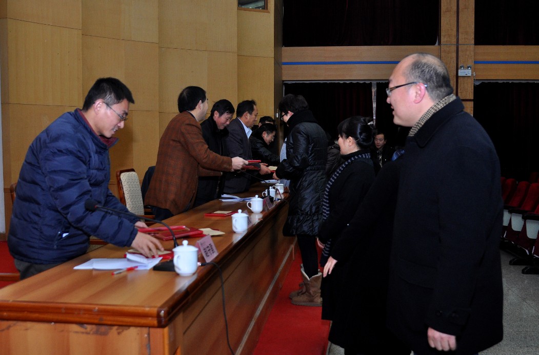 会上,校领导伍鹏程、邓惠宾、邹克扬、蔡永生、赵守盈、乙引代表学校向2013年国家社科基金项目优秀组织奖、教育部项目优秀组织奖、横向社科项目优秀组织奖、全国第六届高校人文社科优秀成果奖优秀组织奖、贵州省第十次哲学社科优秀成果奖优秀组织奖、首届贵州专业文艺奖优秀组织奖的获奖单位和2013年国家社科基金项目获得者颁发了证书。