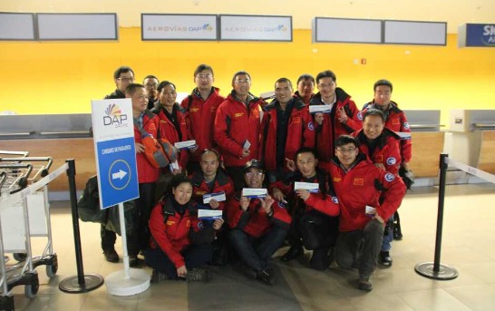 开始登机了。加上在蓬塔与我们汇合的台湾中山大学苏尹帝、陈毓昕搏士,中国第30次南极科考队一行16名队员,高举登机牌,在专用登机口,用数字图象记录下这一精彩瞬间。