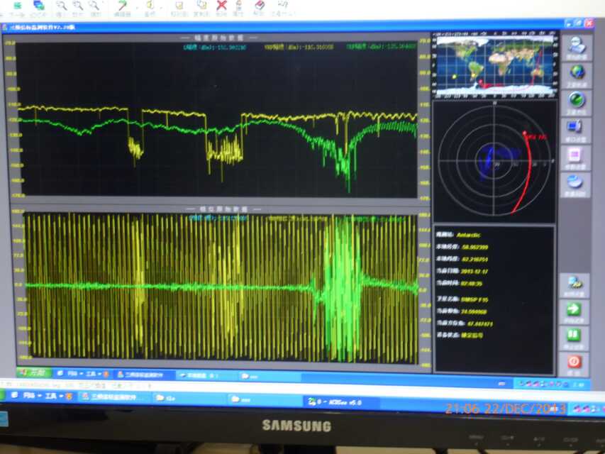 给你们的图片是我们科考队在长城站利用导航卫星(北斗、GPS、GLONASS)和低轨卫星(美国、俄罗斯低轨卫星)进行南极电离层联合測量的信号图和信号接收天线。