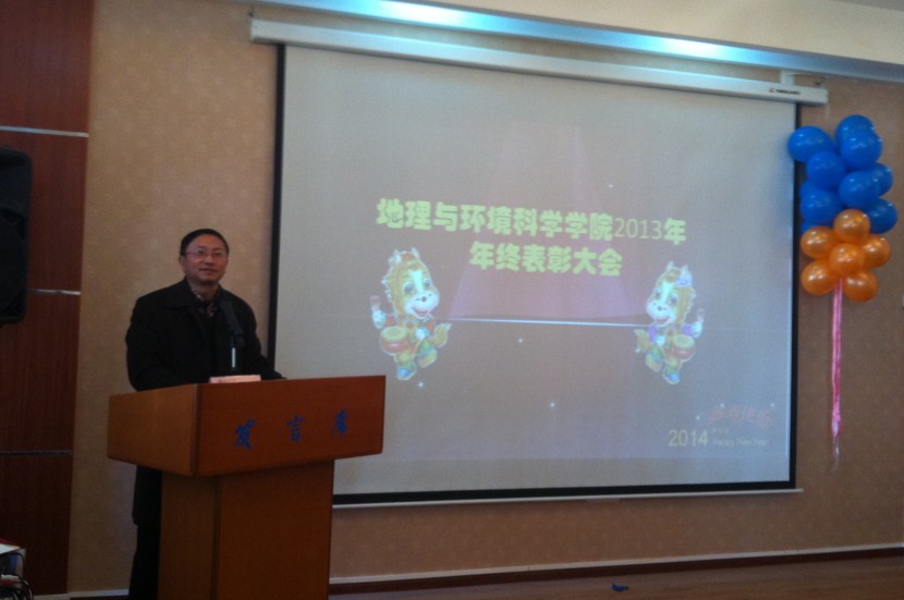 殷红梅宣读了《地理与环境科学学院2013年表彰文件》,对一年来在教学、科研、服务管理方面表现突出的教师进行了表彰。获奖老师代表发言并进行了现场颁奖仪式,并号召全院教职工向获得奖励的老师们学习,营造学院学习先进、争做先进的良好氛围。