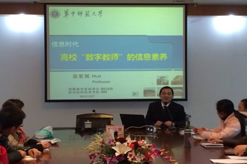 27日上午,来自华中师范大学的吴军其教授给参训教师作了题为“高校教师信息素养”的专题讲座。吴军其教授现为华中师范大学教师教学发展中心副主任,中心以教育信息化为特色,通过现代信息技术与学科教学的融入,吸纳了较多国外顶级大学的优秀教学方法和技术,并取得了突出的成绩。此次,吴军其教授的讲座以强化青年教师的信息意识、提升青年教师的信息技能为目的,对当前教育信息化的理解、培训、应用做了全面的汇报。