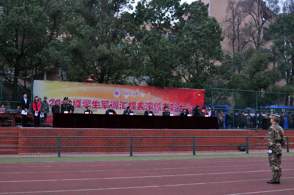 军训汇报表演在激昂的进行曲中开始,2013级学生军训师依次通过主席台接受检阅,学生们端正的身姿、整齐的步伐、响亮的喊声充分显示了昂扬豪迈的精神风貌。军训师还进行了军体拳、队列操等军事科目的汇报表演。