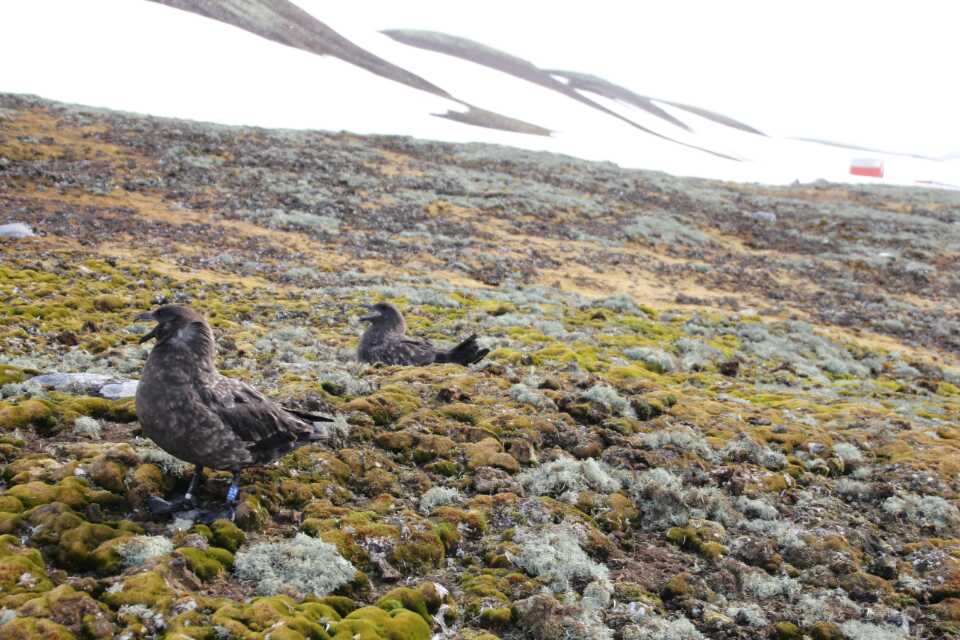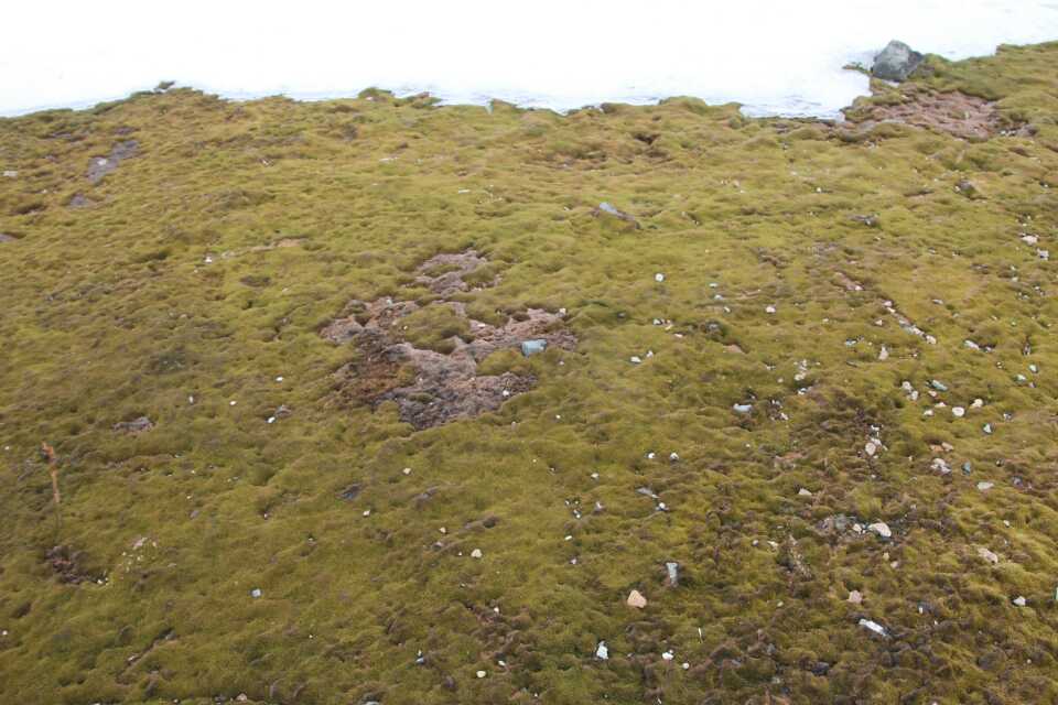 苔藓是我此行南极大陆中见到的最具生命特征的绿色植物,其它就只有白色(雪)和黑碣色(石头、土壤)了。苔藓在各种环境下均可生长,如长在石头和薄土层上,我在企鹅岛上就发现长在企鹅的糞土层上。总的感觉,越潮湿的地方,苔藓长得越好,踏在上面,就像是一层软软的地毯。既然是綠色植物,那苔藓当然是南极大陆生态系统主要的物质生产者之一。它能保持水土、增加肥力、防止土壤的风蚀水蚀,还是南极某些鸟类的生育场所(见图)呢!