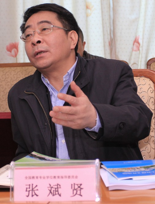 专家组成员、全国教育专业学位教育指导委员会秘书长张斌贤发言。他对我校全日制教育硕士专业学位教育综合改革试点工作很感兴趣,对“0.5+0.5+1” 的培养模式进行了仔细地了解,并对这项改革创新工作表示了肯定,希望我校能坚持改革,为全国高校教育硕士专业学位研究生教育改革积极探索出一条成功的路子。