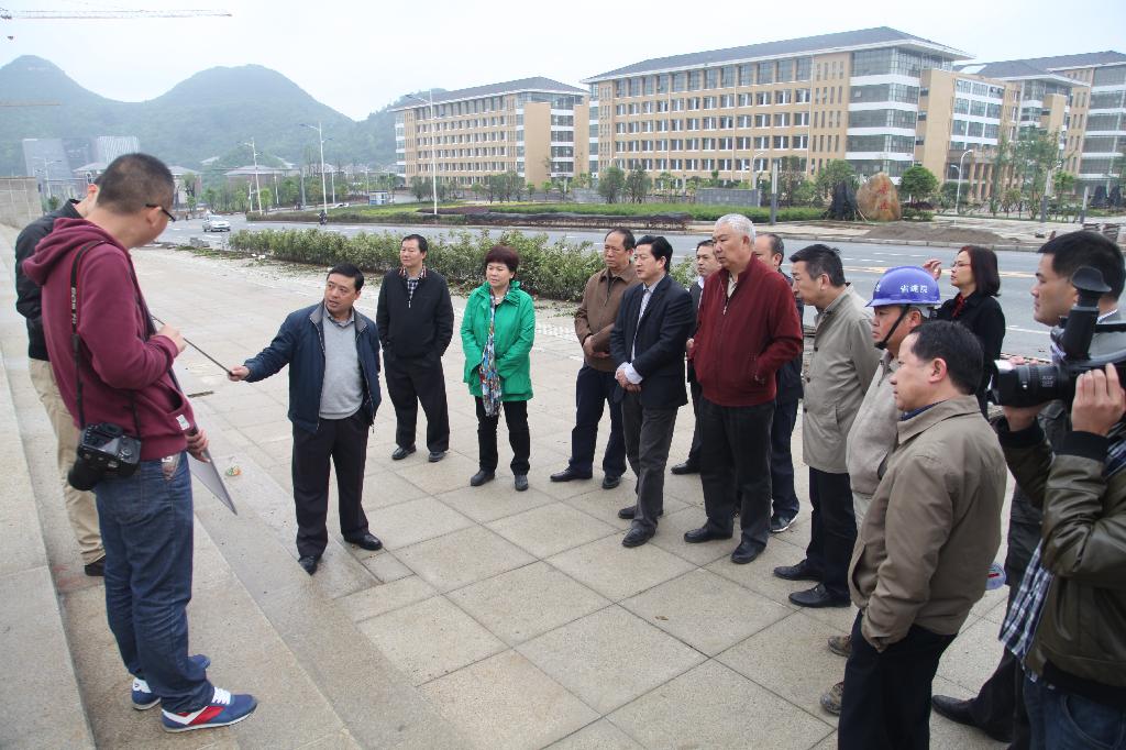 督导组先后视察了南大门、礼仪大道、文理科组团、图书馆、二号学生生活区、三号学生生活区、二号运动场、公租房等在建项目,并详细听取了吕国富对花溪校区的项目背景、建设内容、总体规划、建筑风貌、项目管理与施工进度等情况的介绍。