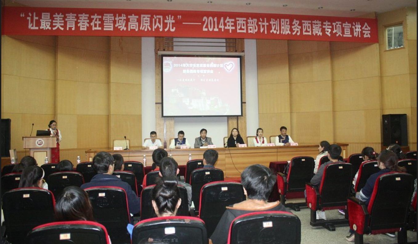 为了切实做好大学生志愿服务西部计划服务西藏专项工作,鼓励更多优秀大学毕业生到西藏开展志愿服务活动, 5月5日,让最美青春在雪域高原闪光――2014年西部计划服务西藏专项宣讲会在我校田家炳教育书院三楼多功能厅举行。共青团西藏自治区委员会学少部部长旦增,校团委书记李娅出席宣讲会。宣讲会由宣讲团成员杨超主持,全校200余名毕业生到场聆听。
