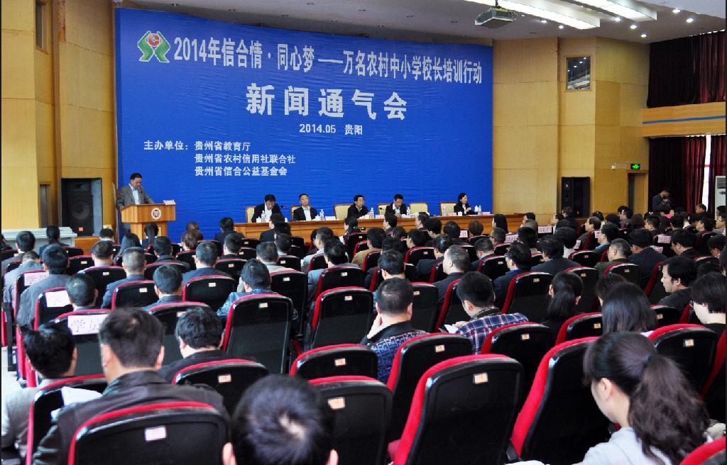 5月5日上午,借我校“信合情·同心梦——万名农村中小学校长培训行动”开班典礼之机,贵州省教育厅、贵州省农村信用社联合社、贵州省信合公益基金会共同主办的2014年“信合情·同心梦——万名农村中小学校长培训行动”新闻通气会在田家炳教育书院三楼多功能厅举行。教育厅厅长霍健康,省农村信用社党委书记、理事长黄秋斌,省联社党委副书记、副理事长宋锐,省信合公益基金会理事长张金兰,我校副校长刘肇军出席会议,省教育厅党组成员、副厅长级督学邹联克主持会议。参加会议的还有承担此次校长培训任务的各高等院校、培训机构的分管领导和培训工作主要负责人,新华社贵州分社、贵州电视台、贵阳晚报、贵州日报等多家新闻媒体,参加此次培训的150名来自遵义、贵阳的中小学校长。