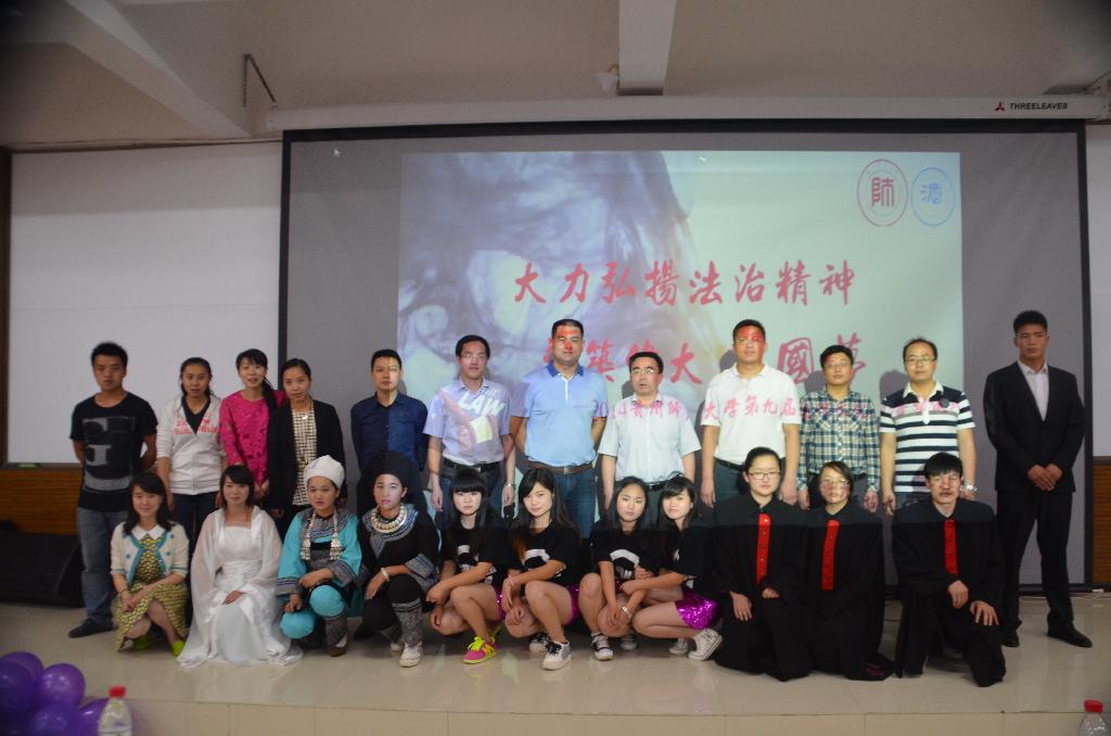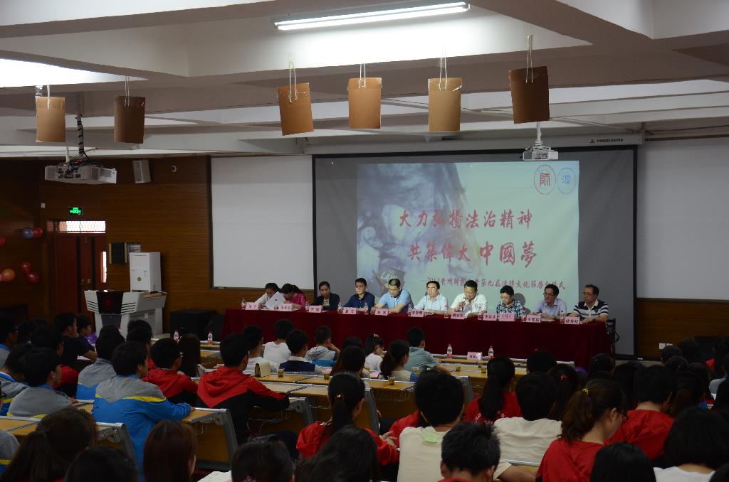 为宣扬法律文化,展现专业特色,体现法学学子精神风貌,5月23日下午,法学院以“大力弘扬法治精神,共筑伟大中国梦”为主题的第九届法律文化节启动仪式在花溪校区公共教学楼6202教室举行。花溪校区管理办公室主任朱杰,法学院党委书记蒙黎明,学工部副部长胡长华,法学院副院长李运才出席。贵州财经大学法学院的代表、我校师生代表共400余人参加。李运才主持启动仪式并宣布第九届法律文化节正式启动。