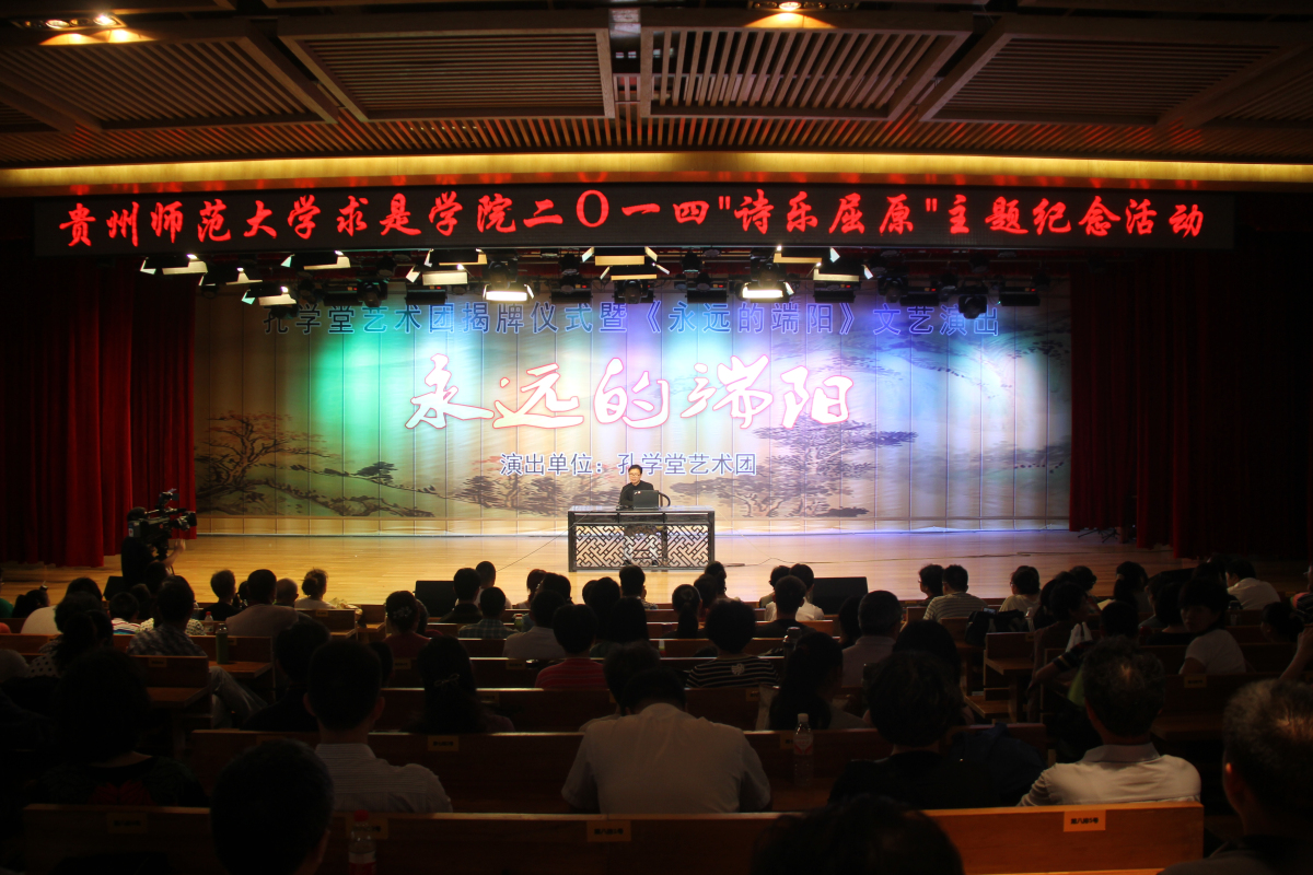 孔学堂前诵国学,端午时节祭屈原。6月2日端午节上午,求是学院师生100余人来到贵阳孔学堂,举行端午节“诗乐屈原”主题纪念活动。求是学院文学与新闻传媒系的同学们身着唐装汉服、梳着发髻,分鸣筝品茗、琴音骚韵、楚辞世界、志学仪式四个环节举行了主题纪念和诵读国学经典活动。求是学院党委书记战勇,院长张静,党委副书记吴大军、万平,副院长杨晓英、李绿山,文学与新闻传媒系系主任李玉芬,教学督导朱伟华,行政系主任帅永平出席纪念活动。