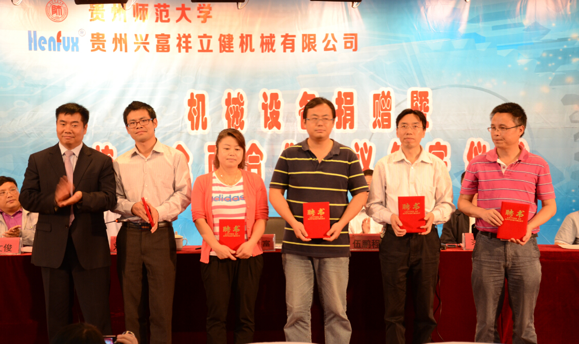 随后,伍鹏程与彭洪富共同为“贵州师范大学机械与电气工程学院产学研基地”揭牌,刘肇军与范虹共同为“贵州师范大学机械与电气工程学院卓越人才联合培养基地”揭牌;胡圣波与边文俊共同为“贵州兴富祥立健机械有限公司工程师技师创新基地”揭牌。揭牌仪式结束后,彭洪富向机电学院苏明教授、郑继明教授、邓静教授、王珩博士、吕长飞博士颁发了“贵州兴富祥立健机械有限公司第一批外聘专家”聘书。