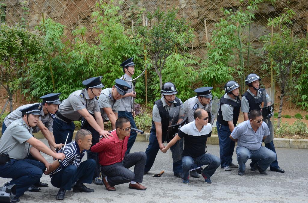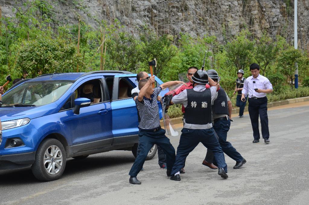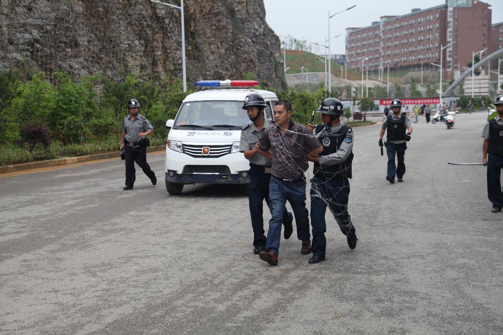 14时51分,指挥中心立即向保卫处和上级领导报告情况并及时报“110”。学校立即成立了以赵守盈副校长为总指挥的应急领导小组,赵守盈下令立即启动《贵州师范大学突发事件应急处理预案》,开展应急处理工作。现场处置组收到指令后,立即开展突发恐怖袭击事件现场的协调、指挥和围捕可疑恐怖分子的工作,并及时向应急领导小组反馈事态进展情况。短短几分钟时间,正在宿舍休息的保安人员也带上相关武器冲到第一现场,与机巡组和步巡组的保安队员对恐怖分子进行夹击,最终,在全体保安队员的共同努力下把所有恐怖分子制服,并顺利移交给随后赶到的公安机关人员,演练活动取得圆满成功。