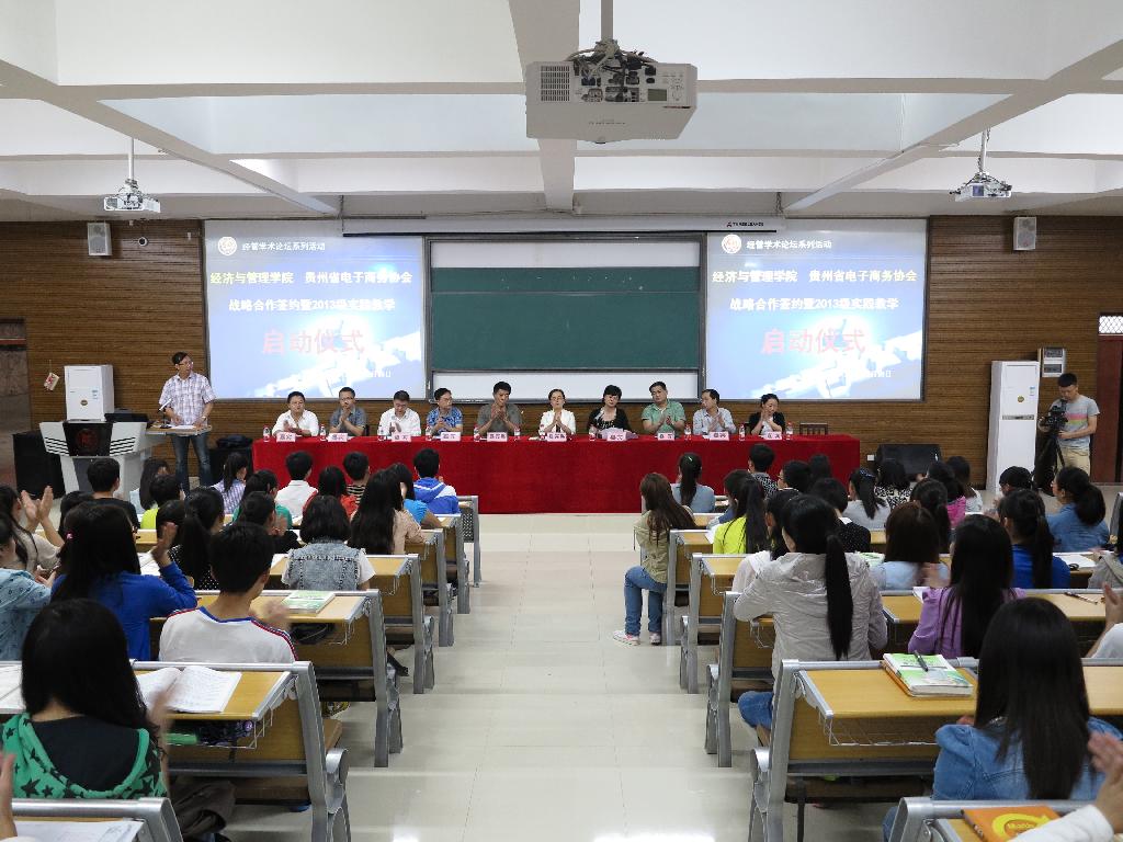 6月16日下午,经济与管理学院与贵州省电子商务协会战略合作签约暨2013级实践教学启动仪式在花溪校区GJ6201教室举行。贵州省电子商务协会会长顾苏军、贵州灵泉秀水酱香白酒交易中心董事长陈雷、贵州朗玛信息股份有限公司行政总监王心福、京东贵州营运大黔网总经理邓琪、贵州诚联科技有限责任公司总经理马红骥和贵州微云科技有限公司运营总监张文锋等嘉宾应邀参加。经管学院院长吕萍、花溪校区管理办公室主任朱杰、教务处副处长杨柳、经管学院党委组织员赵本喜及教师代表出席。仪式由经管学院吴亮教授主持。