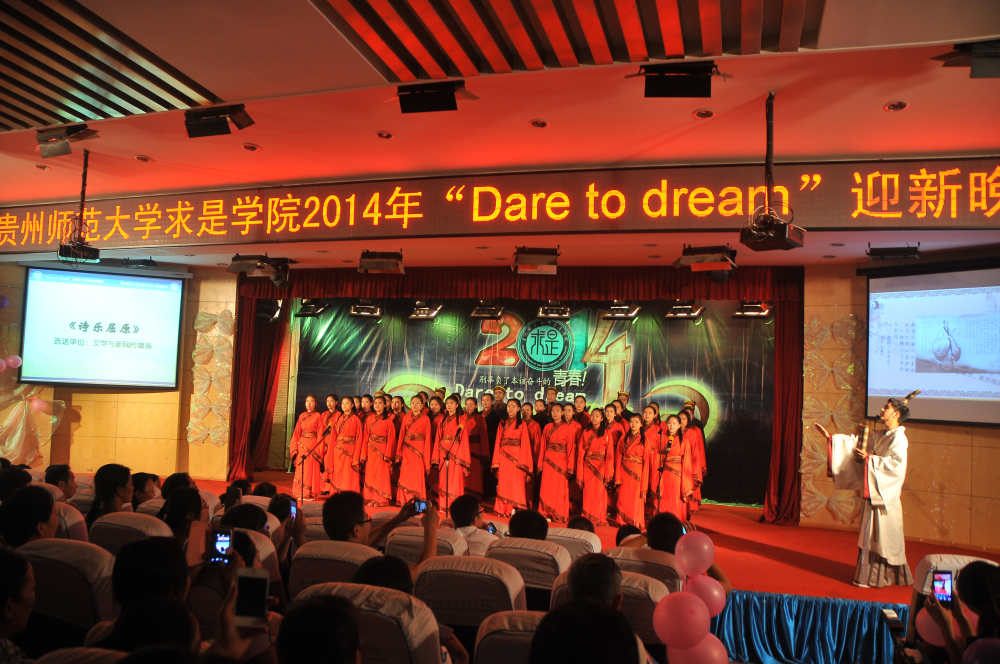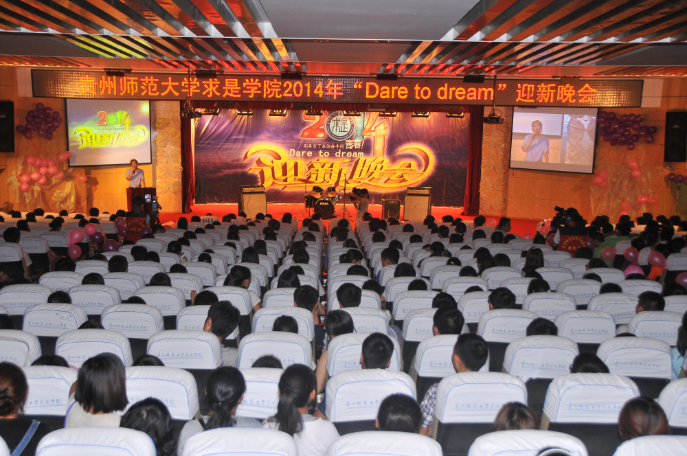 9月12日是我校白云校区新生报到日。当晚,求是讲堂灯光溢彩、喜气洋洋,2014级新生及新生家长代表、求是学院教职工代表共600余人,一同观看了“Dare to dream•别辜负你本该奋斗的青春”迎新晚会的精彩演出。