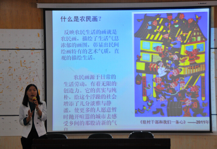 随后,邰昌丽感谢了求是学院教职工对她的悉心栽培和辛勤付出,并分别从“什么是农民画”、“如何创作农民画”、“文化的传播”、“考研经历”四方面与在场师生进行了深入细致的交流。她说道,再次回到母校,触景生情,仿佛在求是学院生活、学习的场景就在眼前。邰昌丽随后通过幻灯片展示,向在场师生介绍了自己的创作,她提到,自己对艺术的理解源于生活,受周边环境的影响,创作的思路来源于平日里对民俗文化的观察和体会,她希望通过开设培训班,教授家乡的孩子们绘画的方法和技巧,宣传多彩贵州苗族文化,共同传承民族文化。她认为读研是提升自己技能水平的一个途径,是实现农民画传承与创新这一梦想的必经之路。她建议同学们注重理论与实际的结合,在实践中磨练自己,创作出更多的优秀作品,与优秀的艺术者进行交流,拓宽艺术视野。