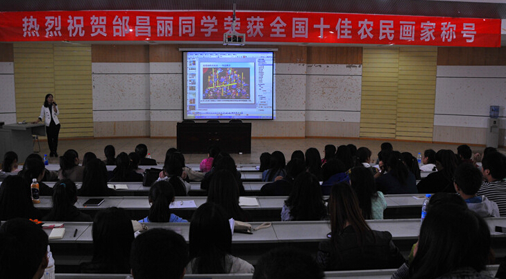 10月24日,在第六届新农民才艺风采大赛中荣获“2014年全国十佳农民书画家”称号的求是学院优秀毕业生邰昌丽回到母校,在求是报告厅召开交流会。求是学院副院长杨先明、教学工作部部长文中晴、美术系行政系主任吴廷柱出席会议,师生代表共计100余人聆听了邰昌丽的事迹,部分师生与邰昌丽进行了面对面交流。会议由美术系行政副系主任王珏君主持。