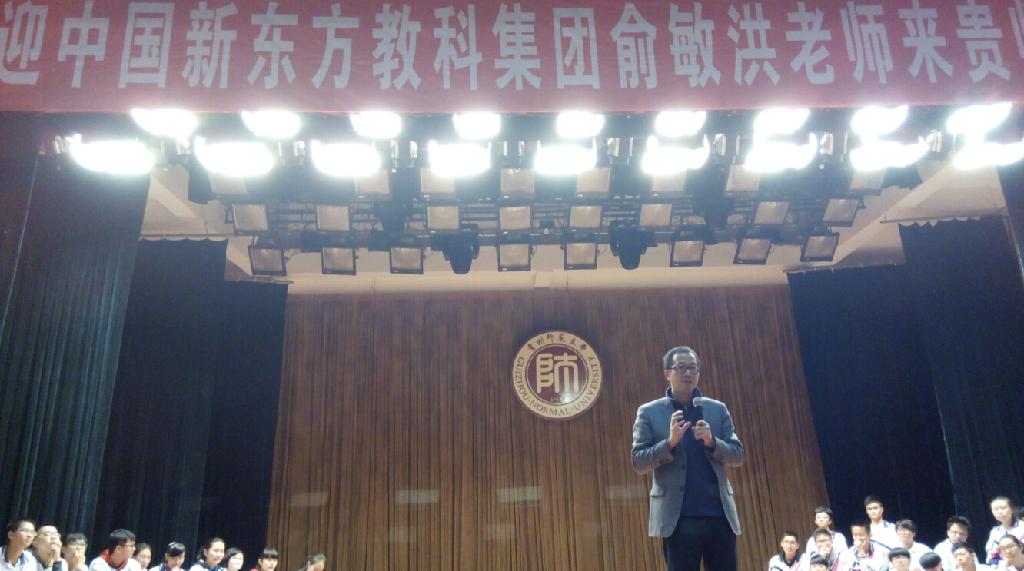 11月4日,新东方教育科技集团董事长俞敏洪应贵州师范大学附属中学邀请在我校宝山校区大礼堂讲学。师大附中党委书记戴鸣、校长王丽萍及1000余名师生到场聆听讲座。