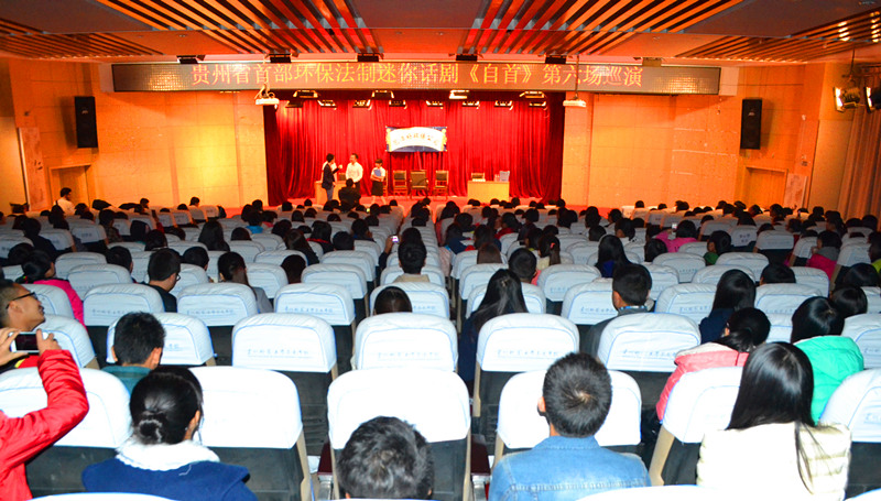 11月14日晚,由省环境宣传教育中心制作出品的贵州省首部环保法制迷你话剧《自首》第六场巡演走进求是学院,在宣教中心主任郑红艺的带领下在求是讲堂开展了巡回演出。求是学院党委副书记万平、团委副书记张怀德以及团委老师和部分社团指导老师、环保协会全体成员及其他社团代表近500人观看了演出。